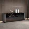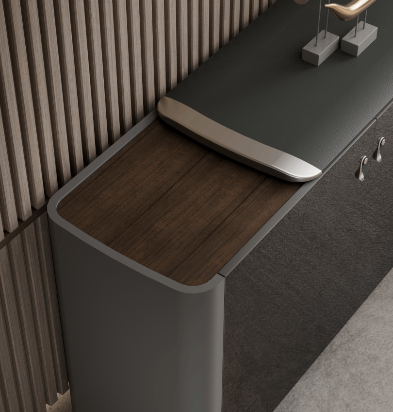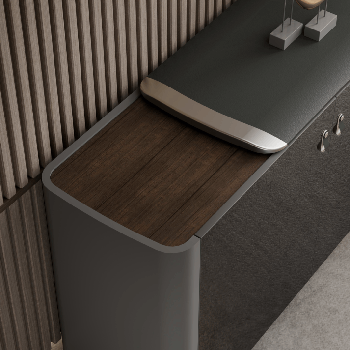 The sleek black high-gloss doors, curved corner joints, and rich walnut veneer create a contemporary and sophisticated aesthetic.