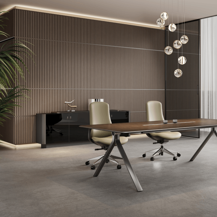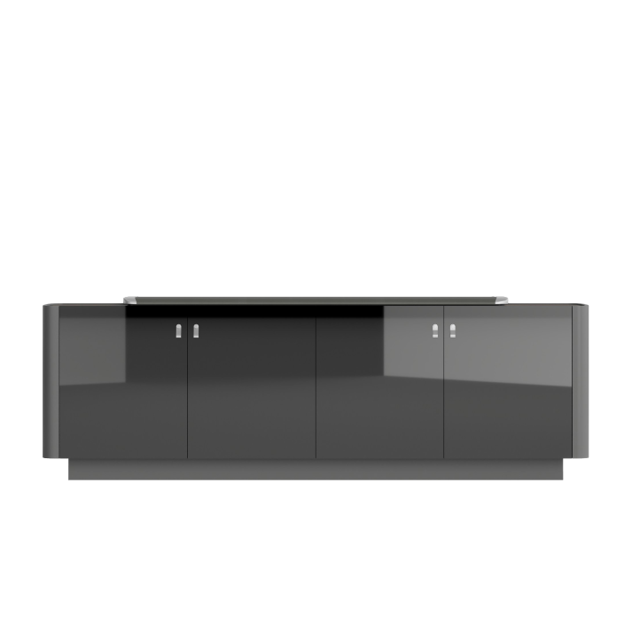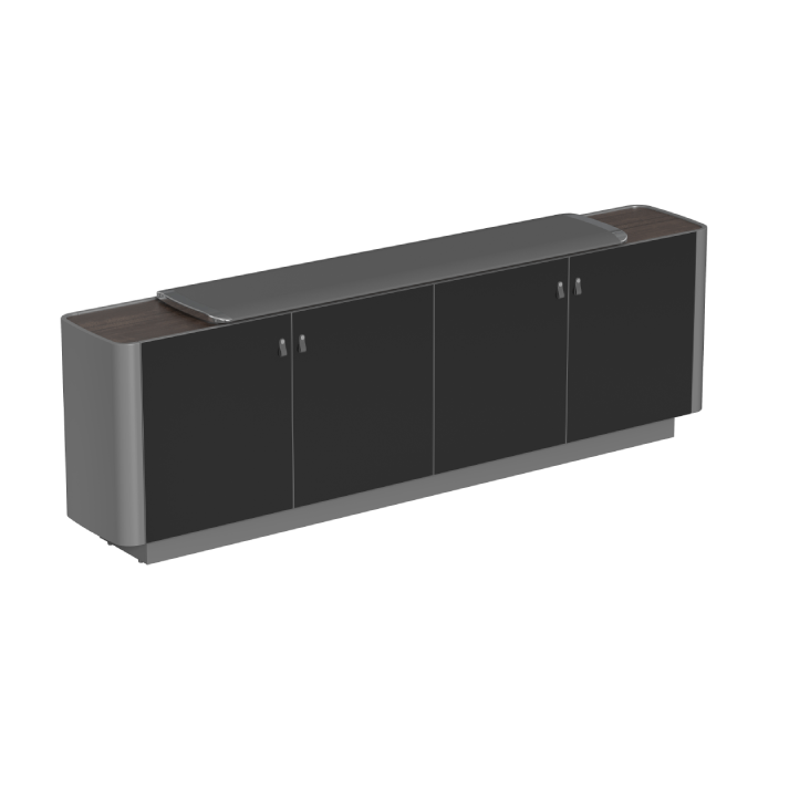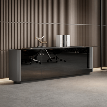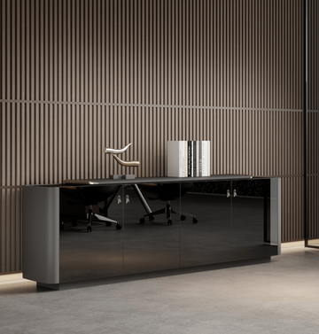 The Gran Executive Credenza seamlessly blends modern functionality with mid-century aesthetics. Its rich Alpine Walnut veneer, combined with the sleek black high-gloss doors and leather handles, creates a sophisticated and inspiring storage solution. This piece is a testament to exceptional design and craftsmanship, elevating any executive space.