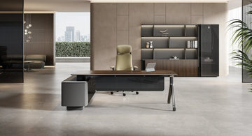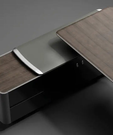 The 3D curved veneer tabletop promotes comfort and productivity, while the floating duo-tone storage unit adds a touch of style.