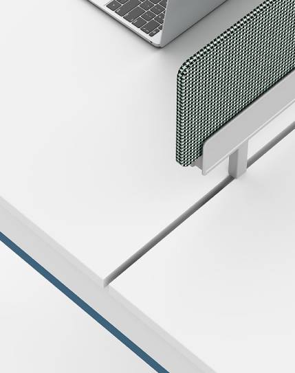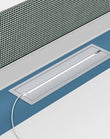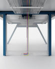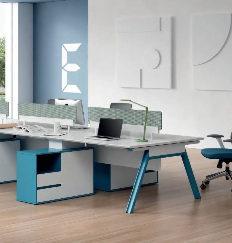 The Magic Cluster workstation features a sleek, contemporary look with marine blue steel legs and flip-top wire management. Its concise design enhances work efficiency.