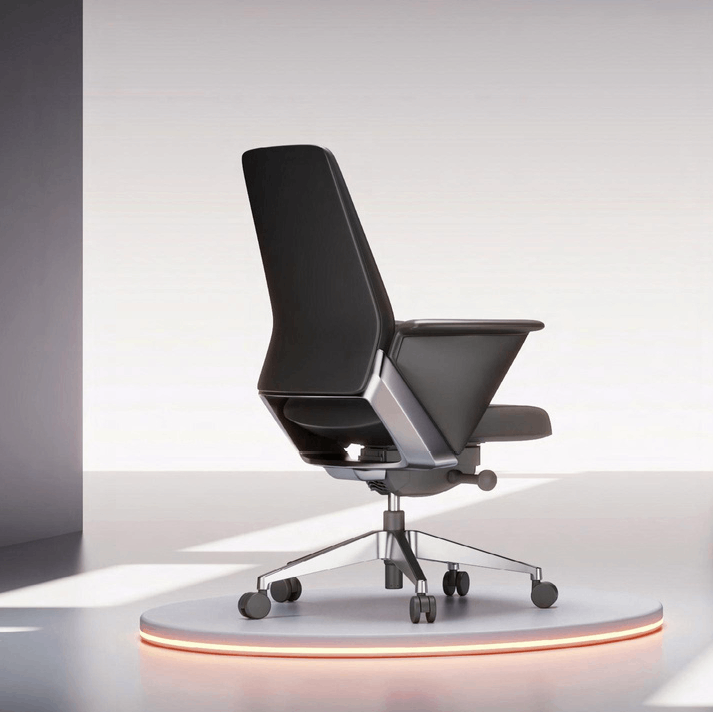 The synchronized tilting mechanism and contoured headrest provide optimal comfort and support.